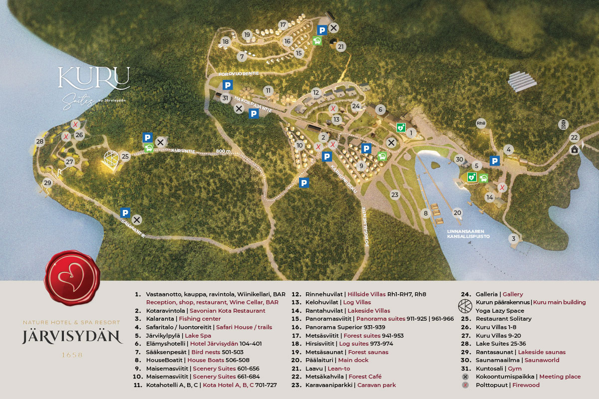 From the area map of Järvisydämen you can see where the accommodations are located, where you can find the spa or restaurant.